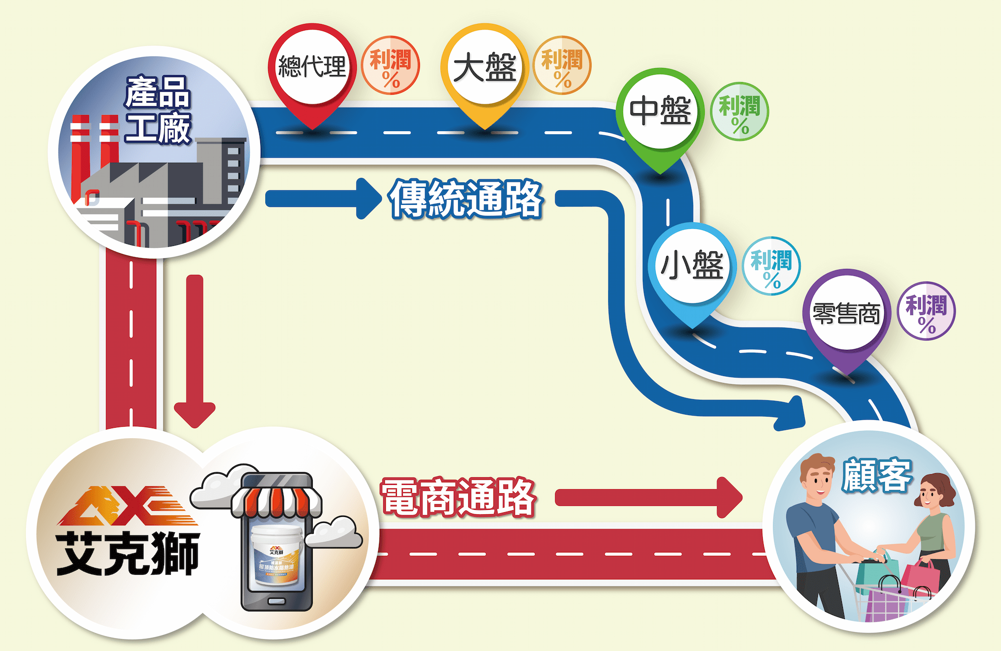 艾克獅油漆由工廠直營,改走電商通路,消費者在電商下單後工廠直接配送到你家,少掉了中間環節的抽成,就可以大幅度提升用在塗料本身的原料等級,來提供優良品質的防水產品。這也是為什麼艾克獅會被網路稱為CP值極高的油漆品牌原因。