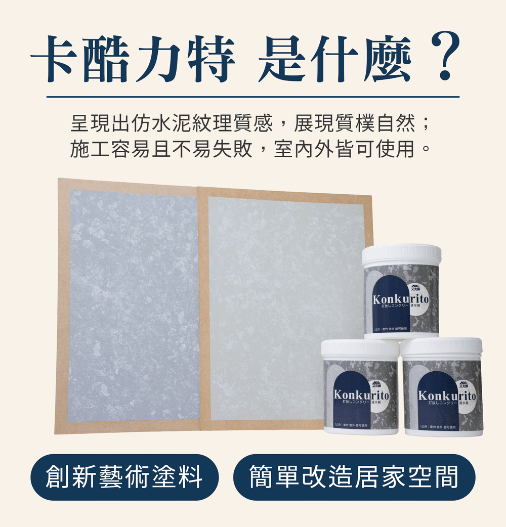 艾克獅L320卡酷力特仿清水模藝術漆 是一款特殊質感藝術漆,能呈現出仿水泥紋理質感,展現質樸自然的特色,施工極為容易並且不易失敗,室內外皆可使用。