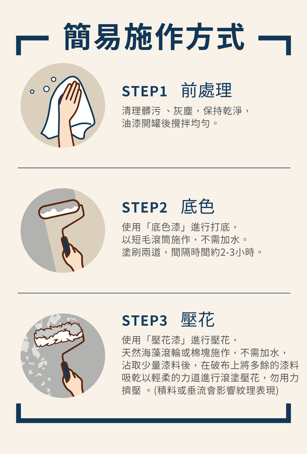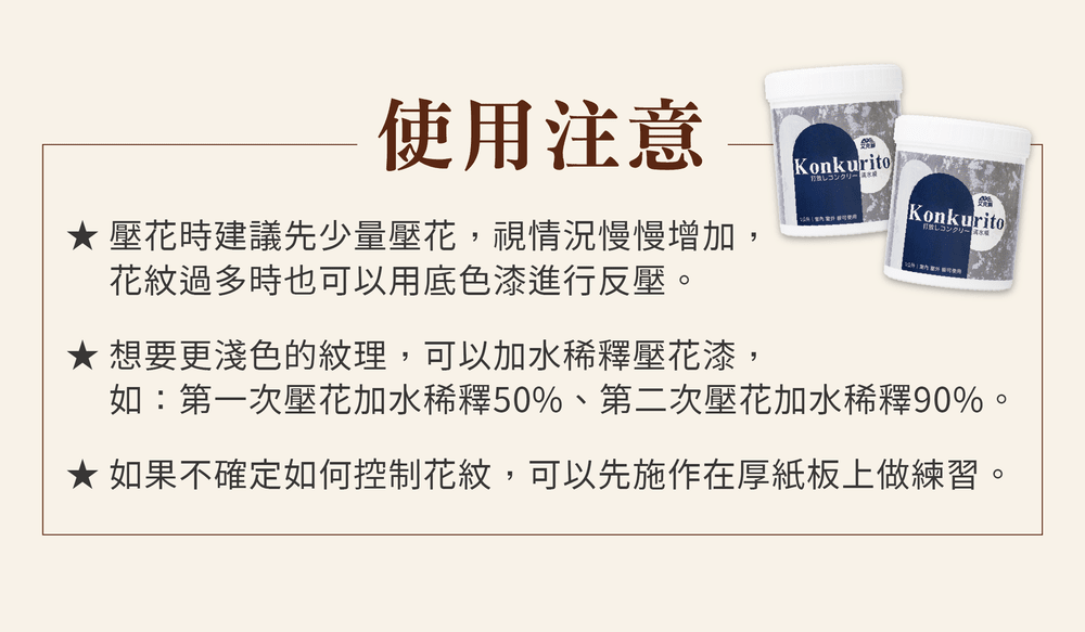 作為底色約可塗佈1.5坪/公升(施作2次)、作為壓花約可塗佈4坪/公升(施作1次)。