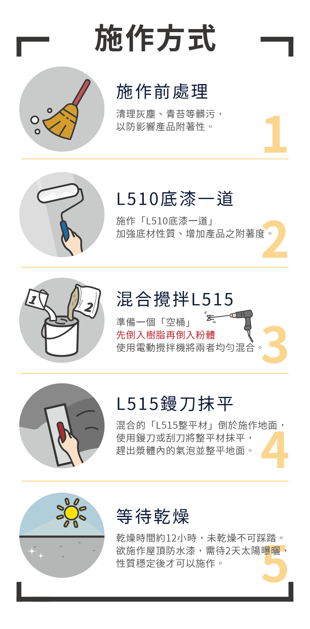 小組(5kg樹脂+25kg粉體):約2坪(乾膜厚度2mm情況下)