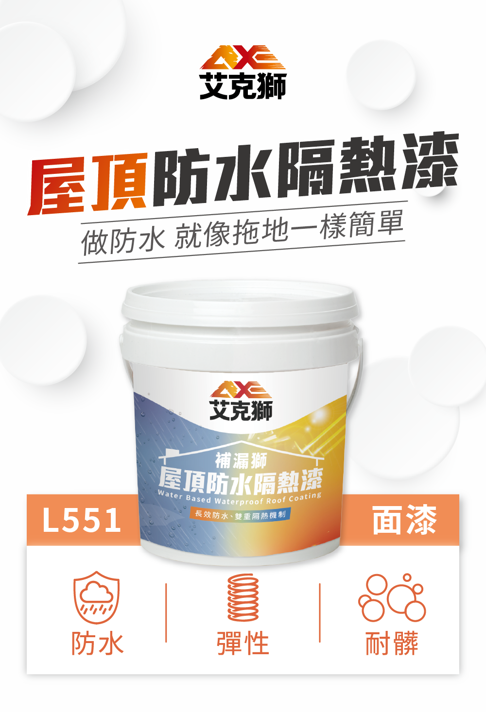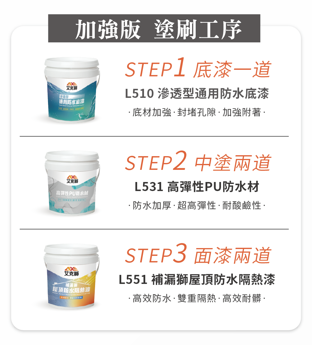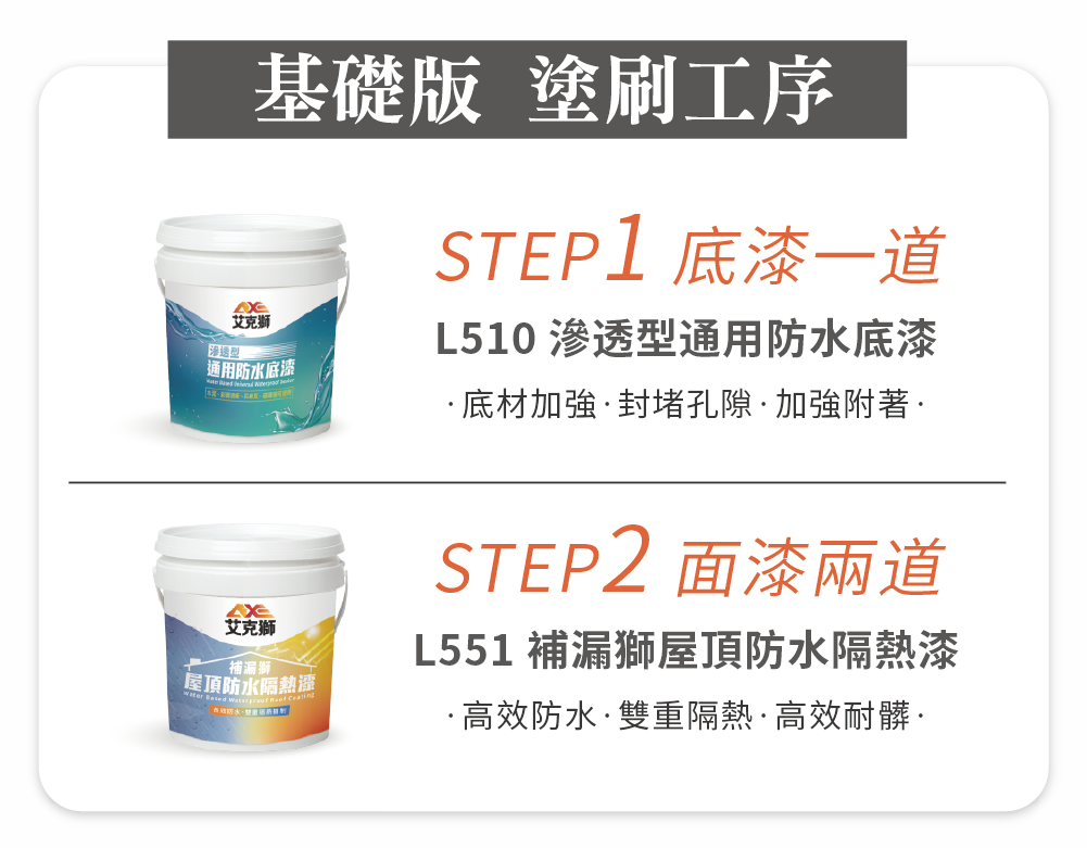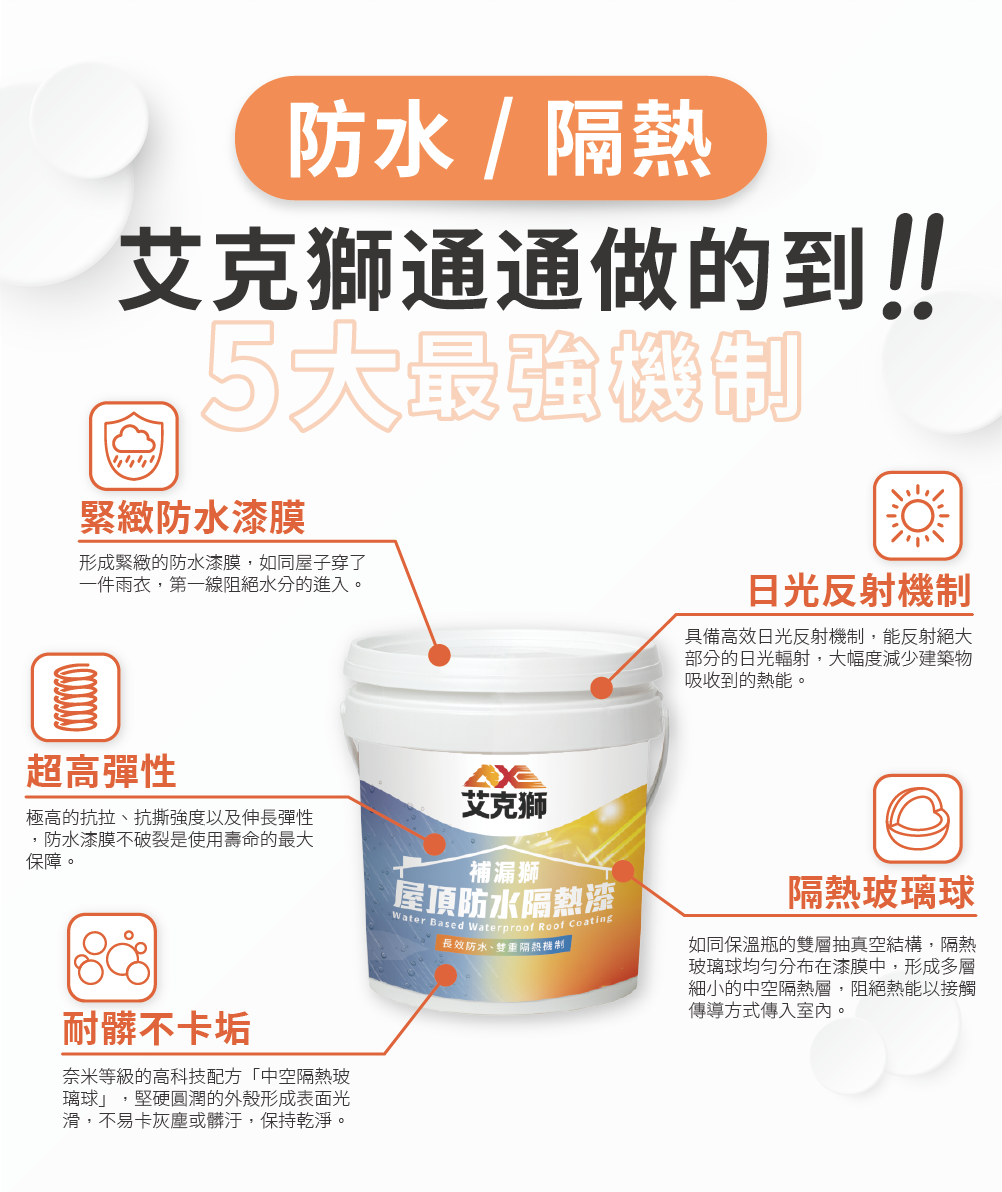 艾克獅新一代產品「PRO補漏獅」首創領先業界「雙重三效」防水隔熱機制,室外擋雨、室內降溫,給您一個舒適健康的居住環境。建議塗佈至少2道,5加侖可塗刷10坪(刷2道的面積)。施作前可先施作L510通用防水底漆以增強效果。