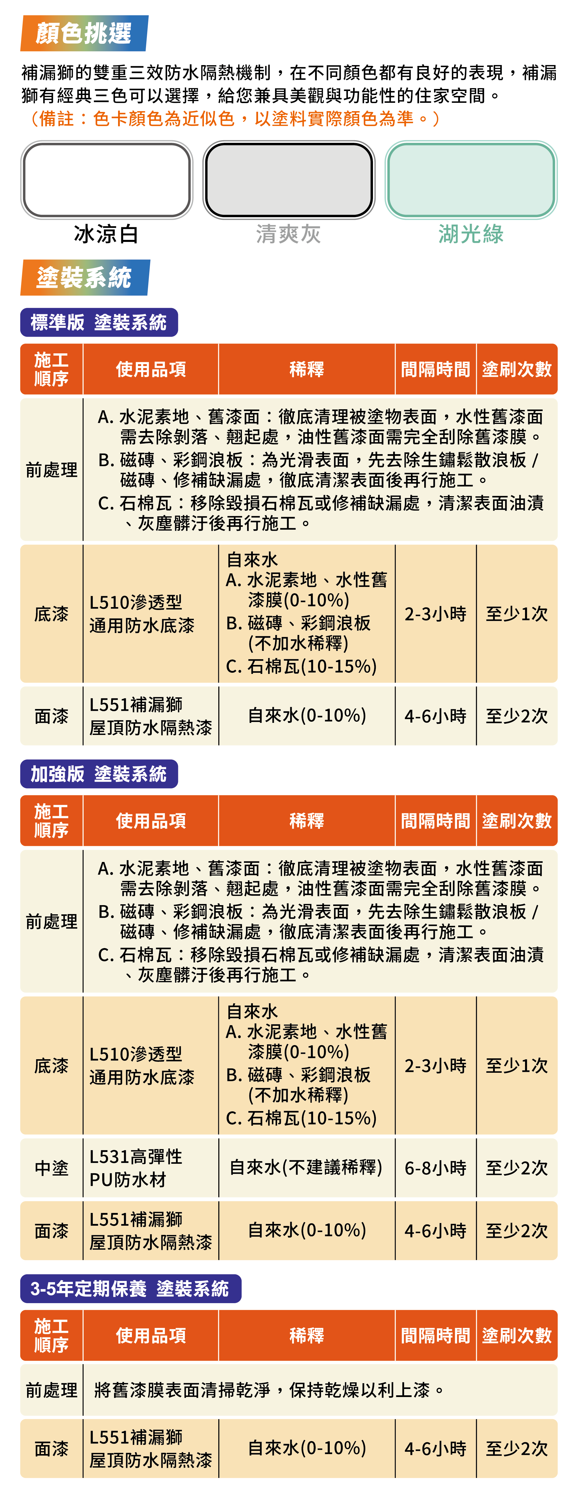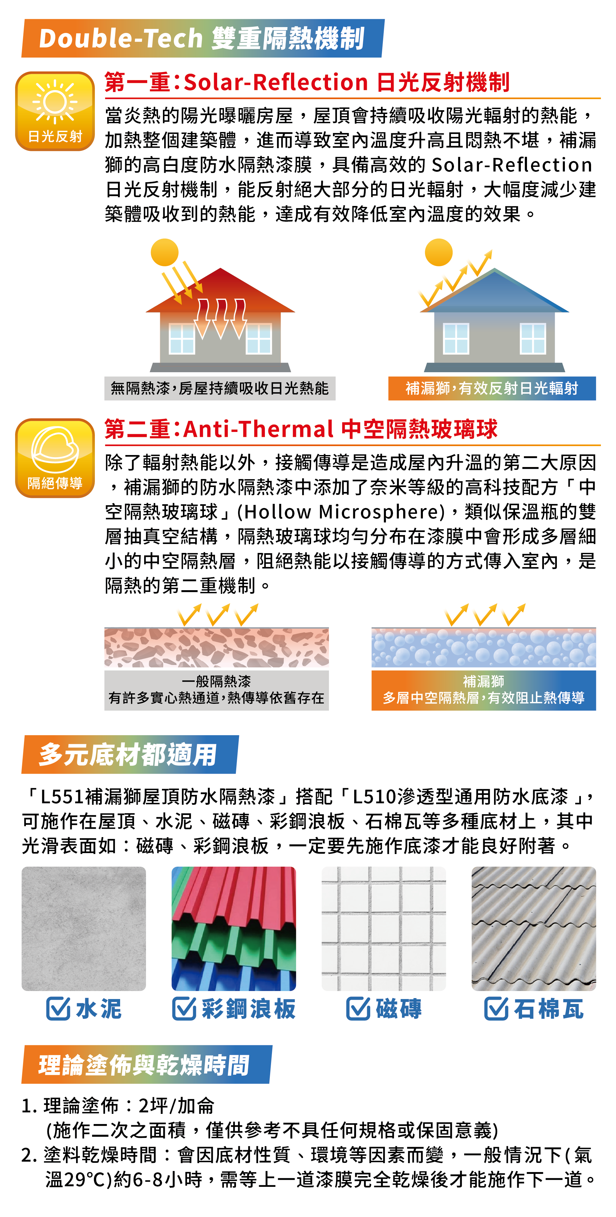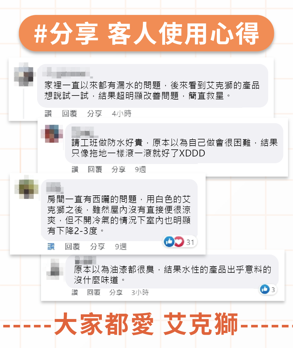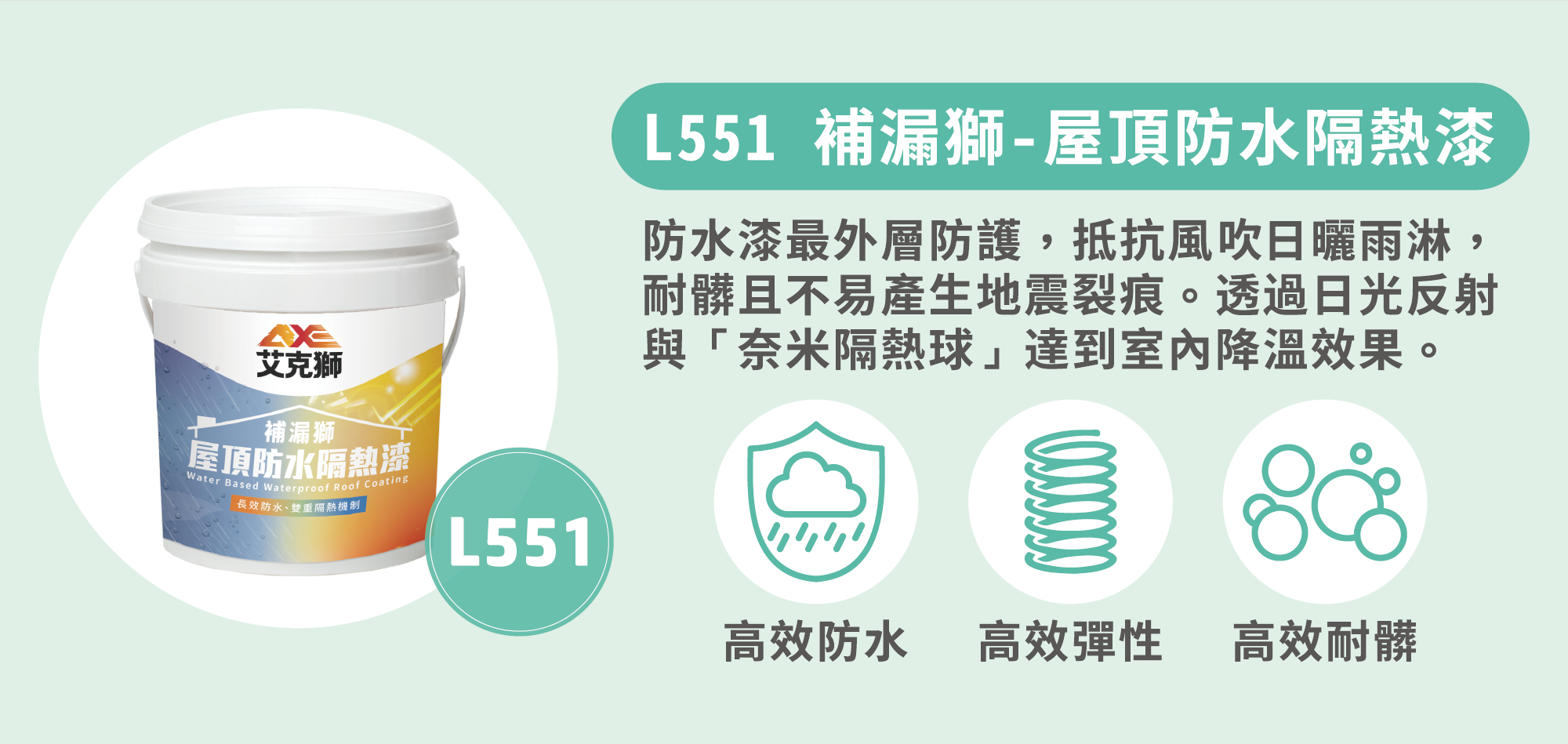 艾克獅新一代產品「PRO補漏獅」首創領先業界「雙重三效」防水隔熱機制,室外擋雨、室內降溫,給您一個舒適健康的居住環境。建議塗佈至少2道,5加侖可塗刷10坪(刷2道的面積)。施作前可先施作L510通用防水底漆以增強效果。