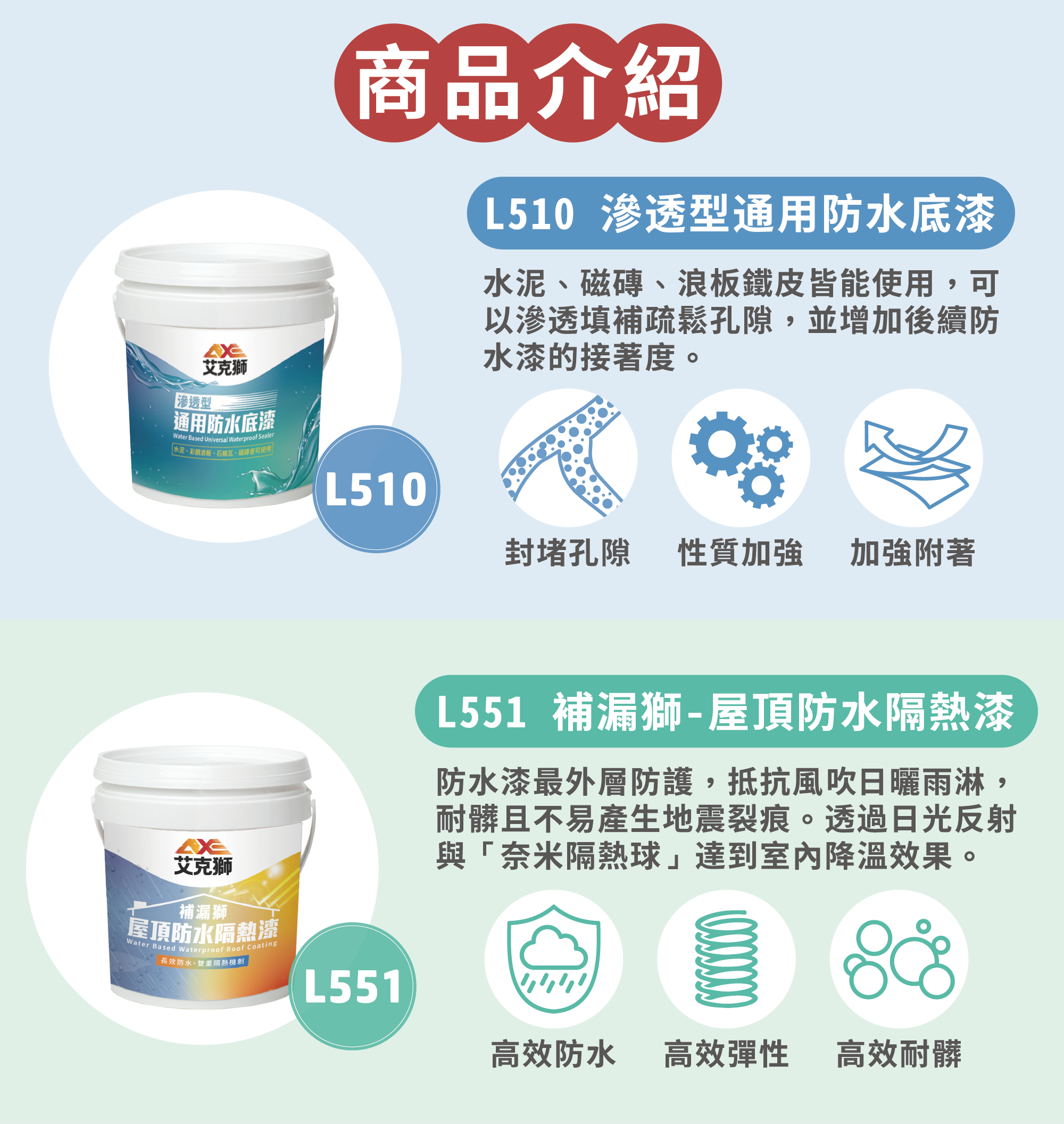 艾克獅新一代產品「PRO補漏獅」首創領先業界「雙重三效」防水隔熱機制,室外擋雨、室內降溫,給您一個舒適健康的居住環境。
