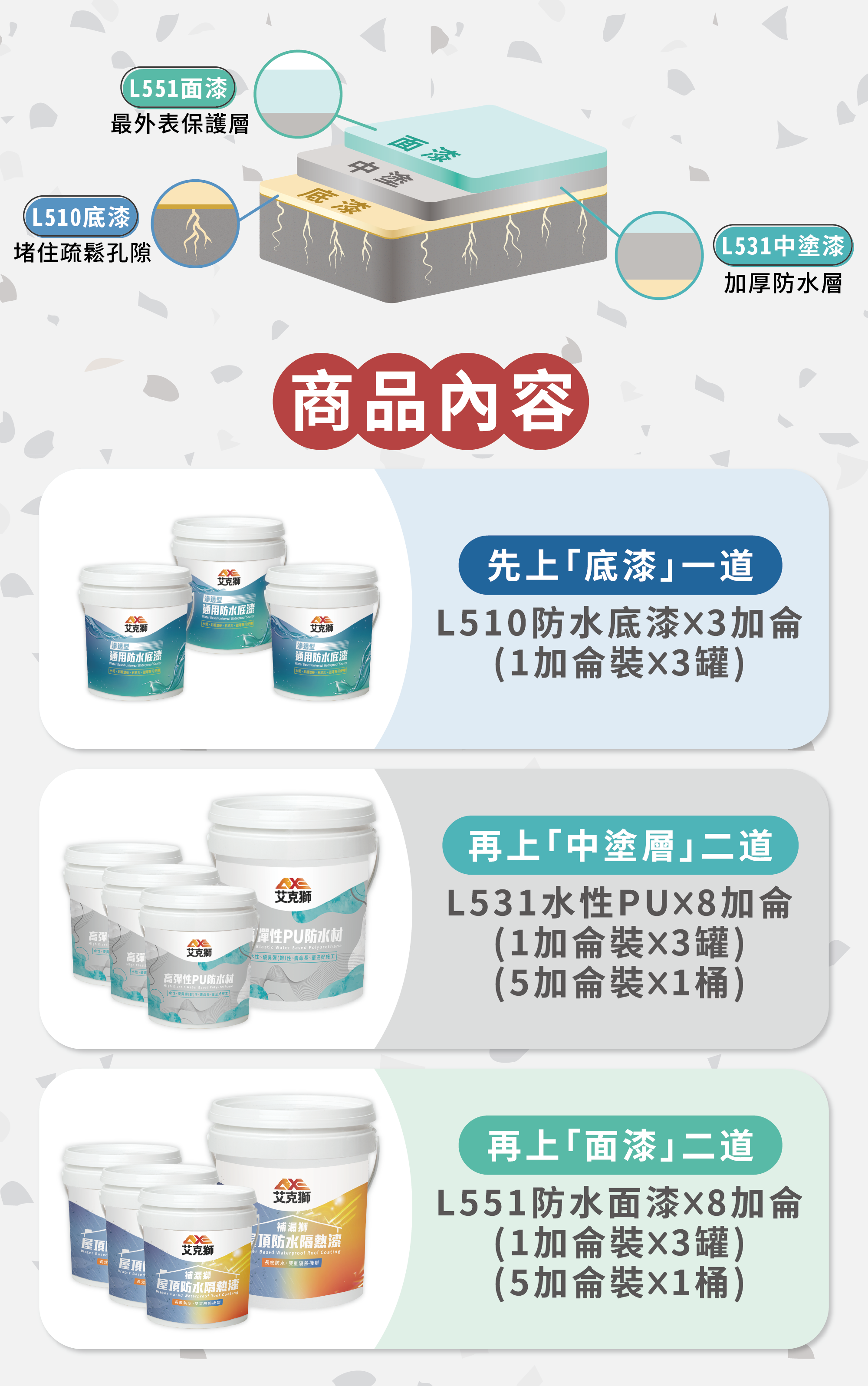 L531中塗PU防水漆×3罐(1加侖裝)+1桶(5加侖裝)